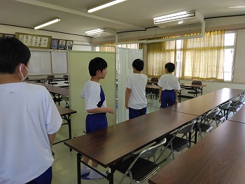 猛暑の対応で、各クラス割り当てられた教室2つに分かれて冷房をきかせての練習です。