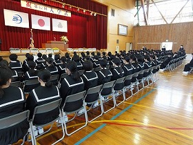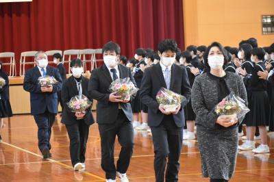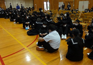 今年も数多くの部活動が県新人大会に参加し、その結果と今後について報告しました。その後、えひめこども美術展に入賞した生徒を表彰しました。整列がスムーズで、返事も良く、どの部活動もはきはきと結果を報告していました。