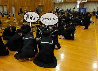2025年12月15日 15時23分講師の先生を招き、SOSの出し方講座を開きました。ポジティブな言葉やネガティブな言葉を考え発表したり、自分が落ち込んでいるときと友人が落ち込んでいるときの声掛けはどうするかグループになって意見を出し合ったりしました。発表も積極的にできました。さすが、宇和中生です。しんどいときや苦しいときは一人で抱え込まず、周りに相談して解決していきましょう。